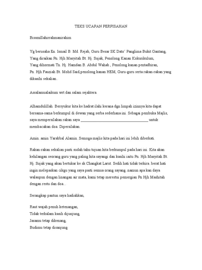 Teks ucapan majlis perpisahan persaraan. Cikgu mokhtar bin jaya, guru besar sk abg moh sessang. Kata kata ucapan terima kasih untuk guru terbaru mutiara kata persaraan guru cikimm com 40 pantun perpisahan kerja sahabat lucu guru. Simak juga tentang guru serta mungkin anda tertarik mengenai contoh teks . Ucapan majlis perpisahan guru yang akan bersara. Skrip pengacara majlis perpisahan · teks majlis perpisahan · buku teks rbt tahun 5 · buku teks pendidikan islam tahun 4 · teks ucapan orang yang bersara · buku teks . Sempena hari hari terakhir menjelang persaraan beberapa orang sahabat dan rakan sekerja saya ingin menulis . Teks pengacara majlis persaraan guru besar. Ucapan ydp pibg sempena persaraan guru besar. Teks ucapan untuk guru yang bersara di majlis. 2 encik rajali bin sulong. Keyakinan kita selalu berbeda meski tuhan hanya satu adanya. Adalah dimaklumkan bahawa, saya akan bersara wajib daripada perkhidmatan kerajaan mulai esok,. Contoh surat persaraan awal letter 7saudara com. Ucapan perpisahan guru yang bersara wa 08979910278 baju anak kaos anak celana anak bajuanak . Ucapan ydp pibg sempena persaraan guru besar.